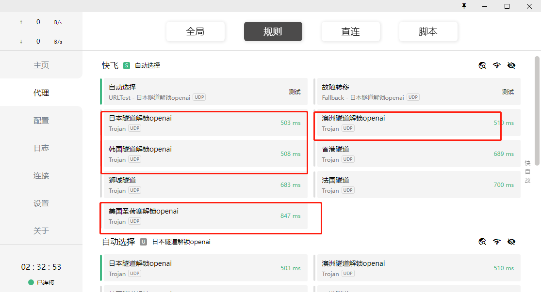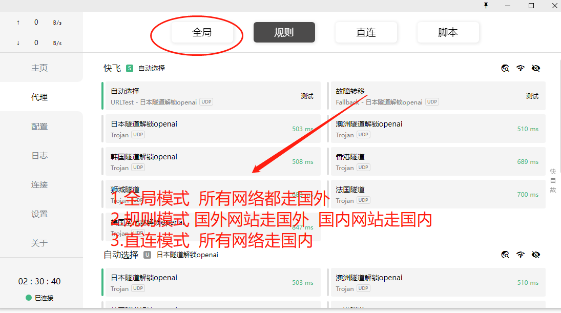 ## <font color="red">⭕️网络节点售后问题 联系教程或者网站右下角客服 在线时间为9:00-24:00</font>⭕️ ## ⭕️一、购买国外节点 ### 1、复制下面这个网址到浏览器中打开 > ### https://qingfeng2028.com 购买付费节点专享超高速网速,除了chat gpt,还可以使用==tiktok、谷歌、ins、youtube、twitter==等其它国外软件 ### 2、注册登录  ### 3、购买订阅-选择合适的套餐付款  ### 4、下载Clash 导入付费节点 #### 4.1 下载安卓Clash软件 >## 👉[点击下载安装](https://wwpx.lanzouw.com/b048aiu5g)👈 #### 4.2 安装Clash软件 下载到本地,进行安装,安装后打开Clash  双击图标打开Clash,打开软件.  #### 4.4 打开网站首页 一键导入订阅  #### 4.5 下载后要选择订阅,注意选择后左侧会显示绿色  #### 4.6 点击Profiles,这里有三种连接模式 * **Global全局模式** 选择这个后所有网络都走国外,国内百度、淘宝都会是国外网络,如果是使用国外软件,建议选择这个Global模式 * **Rule规则模式** 选择这个后 国内网络还是走你本地网络 比如淘宝、百度还是你本地网络,但是谷歌、油管等,都是走国外网络,选择Rule模式某些网站或者国外软件可能会访问不了 可以优先选择Global模式 * **Direct直连模式** 选择这个后 所有网络都走你本地,这个是访问不了谷歌等国外网址的。  这里我们选择Global全局模式, 选择解锁chat gpt的节点 重点:==后面显示解锁openai的部分新加坡和日本可用 ,这些节点是解锁chat gpt的==,选择其他节点无效,尤其不能选择香港、台湾、俄罗斯线路,这些地区禁用chat gpt  #### 4.7 点击连接General,System Proxy 这里要选中连接,这样就可以访问国外网络了  如果不使用了,这里在关掉 ) ## <font color="red">⭕️网络节点售后问题 联系教程或者网站右下角客服 在线时间为9:00-24:00</font>⭕️